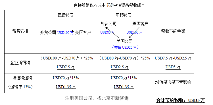 运用海外公司进行中转贸易的优势------外贸公司 一、进行合理的税务筹划:基本原理就是利用好税收政策,利用地区与地区之间的税率差异。 假如美国客户下单USD100万给国内外贸公司,外贸公司将USD100万的货物出口给美国客户,假定这批货物的采购成本价是USD70万,利润就是USD30万。那在完成此项贸易后,要交纳25%的企业所得税,并且以后股东分红还要交20%的个人所得税。 如果现在,您成立了一间海外有限公司(以美国公司为例)。可以用自己的美国公司接美国客户USD100万的单子,而后美国公司以USD80万下单给国内外贸公司。在您美国客户收到货后,会按合同将货款L/C或T/T给您美国公司USD100万,您美国公司再转帐80万给国内外贸公司做“外汇核销”。这样20万的利润就留存在您美国公司的帐户中。并且按照美国公司的税务条例,只要您的利润不是来自于美国就不需要交纳美国的利得税。(您的海外公司在中国可以开立离岸户,其中的资金可以在国内外自由运转,不受外汇管制)。 二、美国有限公司实务操作 中国外贸公司以70万美金的价格出口给美国公司,美国公司再以100万美金的价格卖给美国客户,具体的实务操作如下: