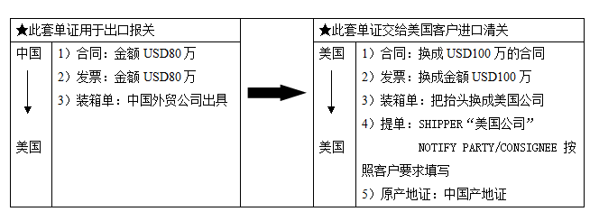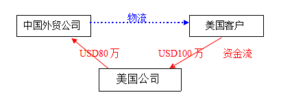 (1)物流 货物由中国直接运往美国,无需经美国转口。 (2)资金流 美国客户先把USD100万打到美国公司的账户上,美国公司再转USD80万回国内,USD20万利润留在离岸账户。 (3)单据 由中国外贸公司办理国内的报关手续,报关金额为USD80万,此外以美国公司的名义出一套USD100万的单据给美国客户。详细单据操作见下: