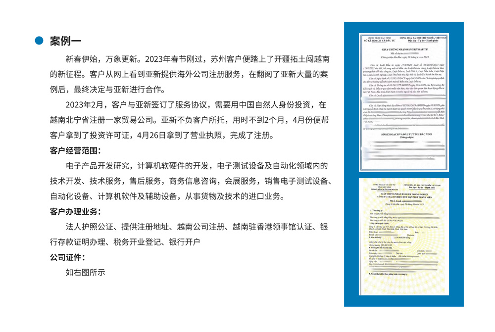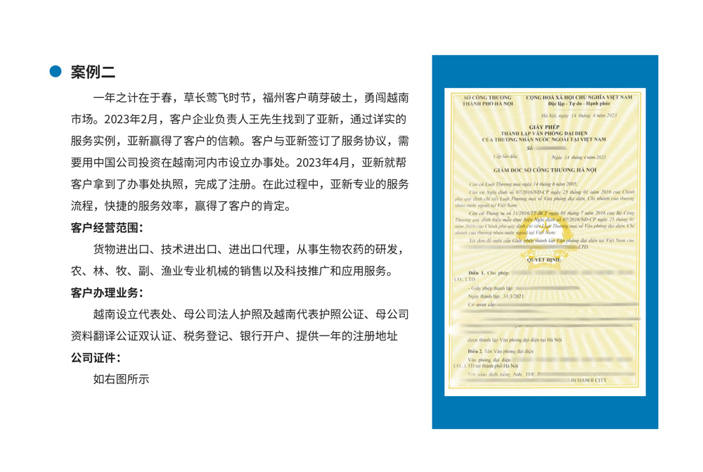 北京亚新通达商务咨询有限公司是一家享有良好声誉的商务服务型公司,总部位于北京,在上海、深圳,杭州,中国香港,印度新德里,越南胡志明,越南河内设有子公司,在日本大阪、韩国首尔、印度尼西亚雅加达、泰国曼谷设有办事处。