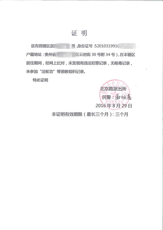 2、申请人户籍所在地或居住地的派出所开具的无犯罪记录证明