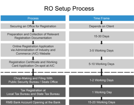 A Rep Office takes less time generally to establish than any other business entities for FIEs in China and the process is illustrated below: